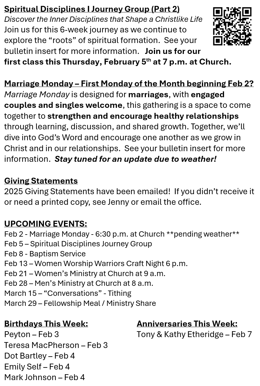 Due to the Winter Storm Warning currently in effect, we have made the decision to cancel this Sunday’s in-person church service as well as the Spiritual Disciplines class on February 1st for the safety of our congregation. The Currituck Rehab Service at 2 p.m. has been canceled. In addition, our baptism service has been moved to Sunday, February 8.